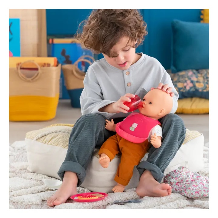 Time to eat! The Large Mealtime Set includes everything needed -- accessories and pretend food -- for a favorite large Corolle baby doll at mealtime: divided feeding dish, fork, knife, drinking glass, food-catcher bib and cloth napkin plus these pretend foods: a fried egg, a slice of strawberry tart, a cookie and an apple compote.