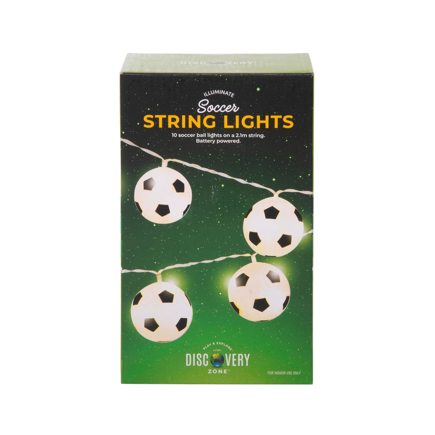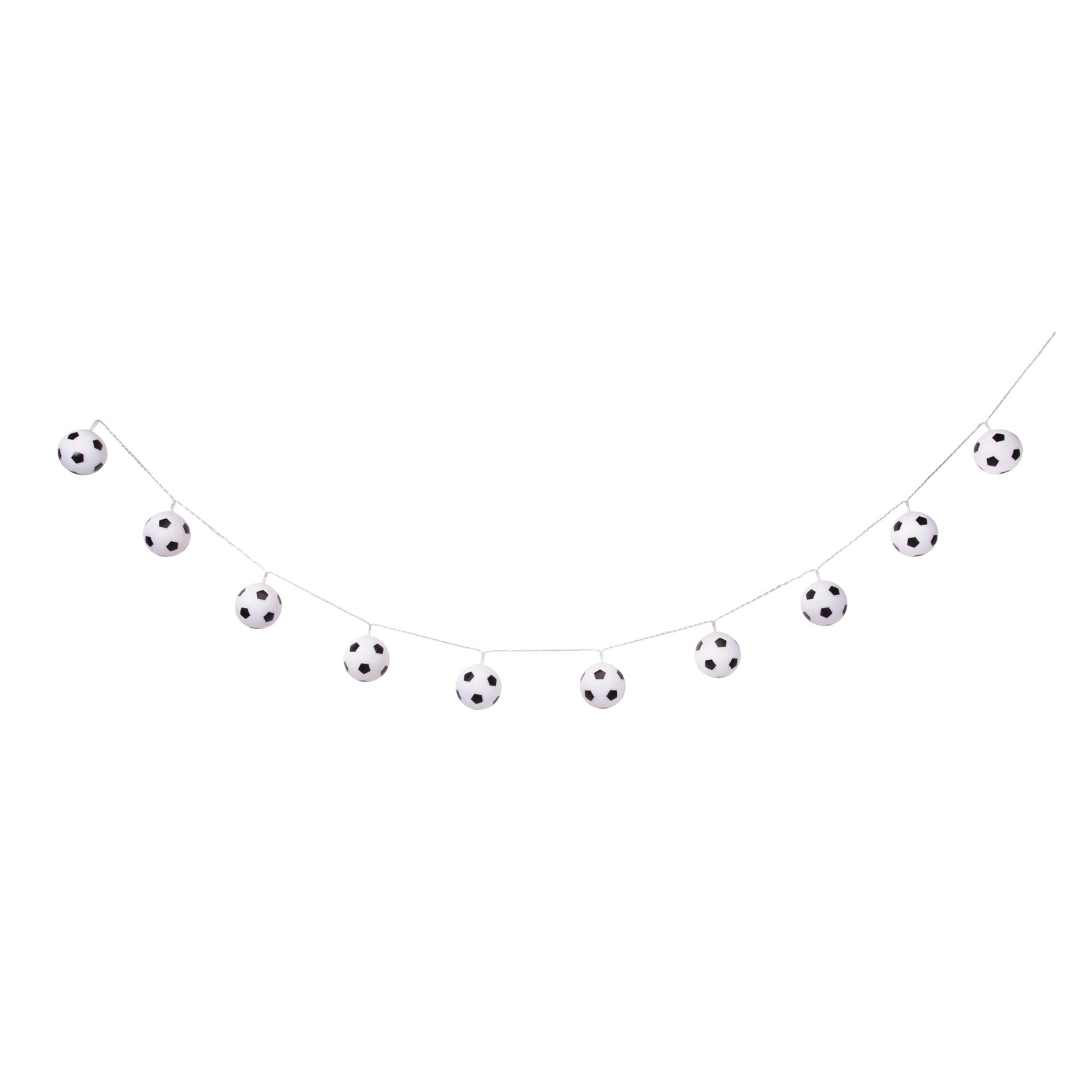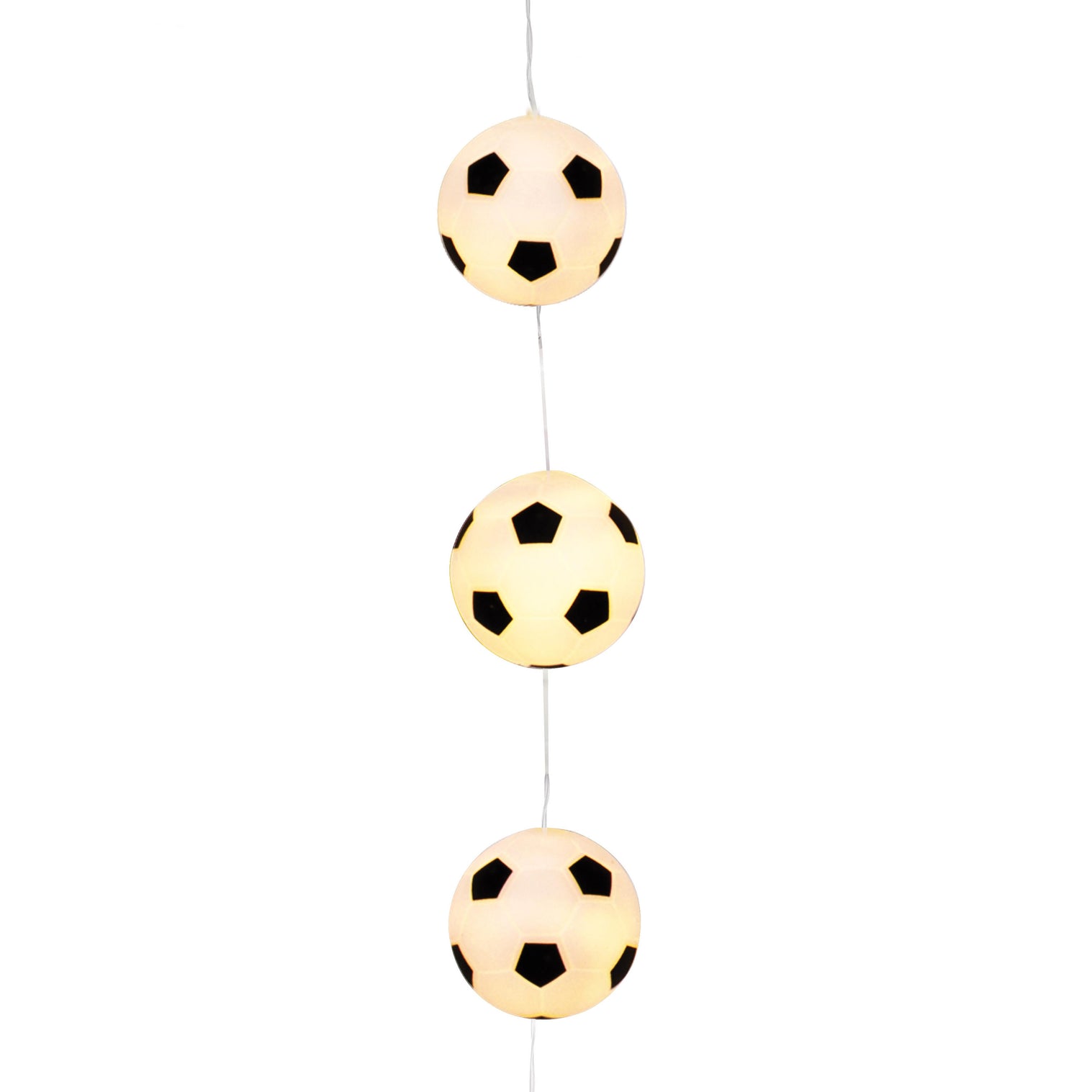 Product Description Set of 10 light up soccer balls.White LED light.Length 2.1m. Battery powered.2 X AA BATTERIES (NOT INCLUDED).