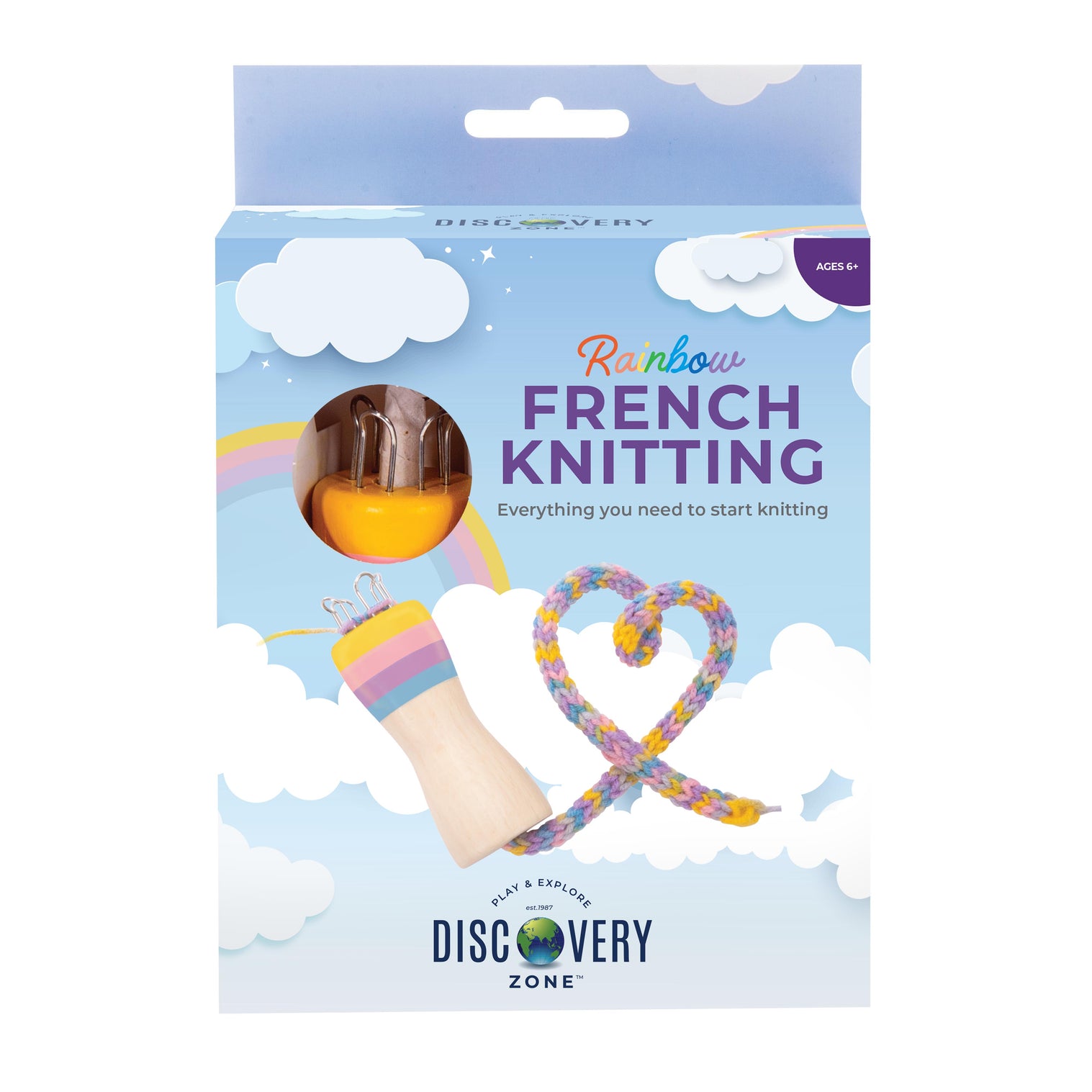 Set includes: Wooden rainbow knitting doll, wooden needle and over 50m of rainbow coloured wool.