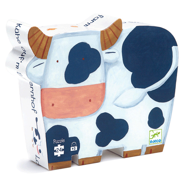 Will the lost chick find its mother hen? A superb 24-piece puzzle in a stylish cow-shaped box.
