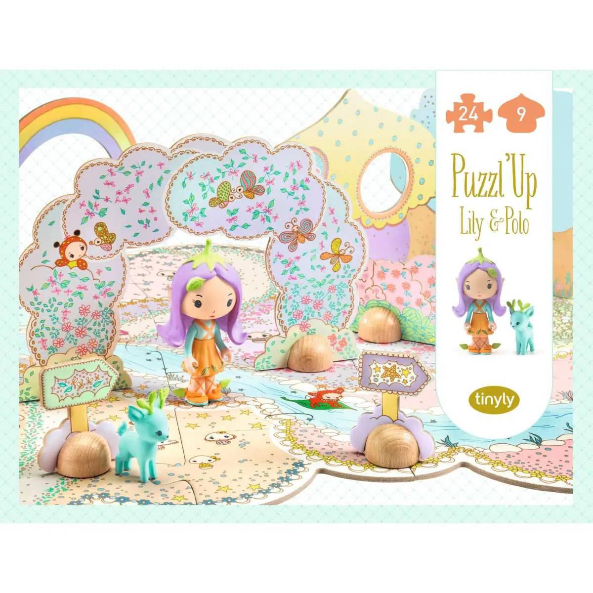 Discover a new concept: puzzl'Up. A floor puzzle with vertical pieces mounted on wooden bases for play and storytelling. An enchanting and delightful world made up of 24 floor pieces and 4 vertical pieces, including a floral arch, two cute mushroom houses and a charming shrub.In this scene with soft colours and beautiful details, the elf Lily and her loyal companion the deer Polo go on extraordinary adventures. The gentle babbling of the magic river adds a touch of serenity and magic to their whimsical adventures.Soft-coloured creatures with delicate features from the magical world of Tinyly.