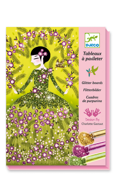 Contents: four sticky-faced boards, six tubes with coloured sequins, 1 gadget, a brush and step-by-step instructions.