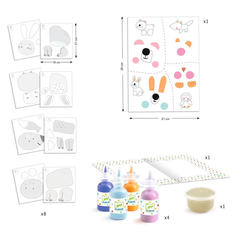 A beginner’s painting activity for ages 18 months and up. Adults tear off the shapes and place the paint on top. Next, it’s over to the children to put their hands in the paint and splash around as they smear the shapes! Then, assemble the shapes and add the stickers. There are 4 absolutely lovely 2D animals to create.