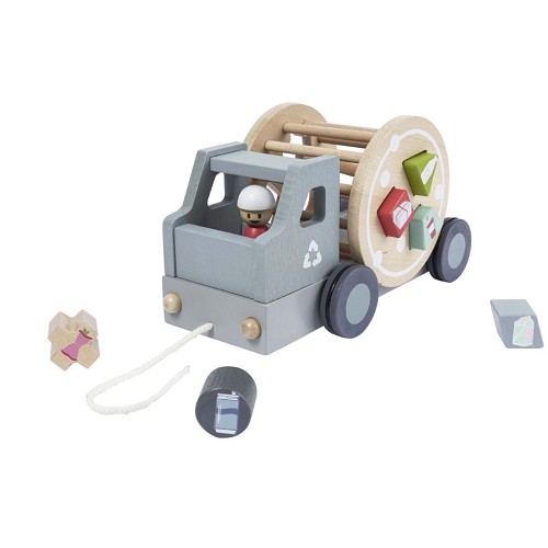 The pull-along recycling truck will educate your child about waste separation in a playful way. Six different types of waste can be sorted in the truck using the containers provided. The blocks are in different colours and shapes, which helps strengthen hand to eye coordination and understanding of colours and shapes. The rubbish drum which rotates as the truck is pulled along creates an extra stimulus to play.