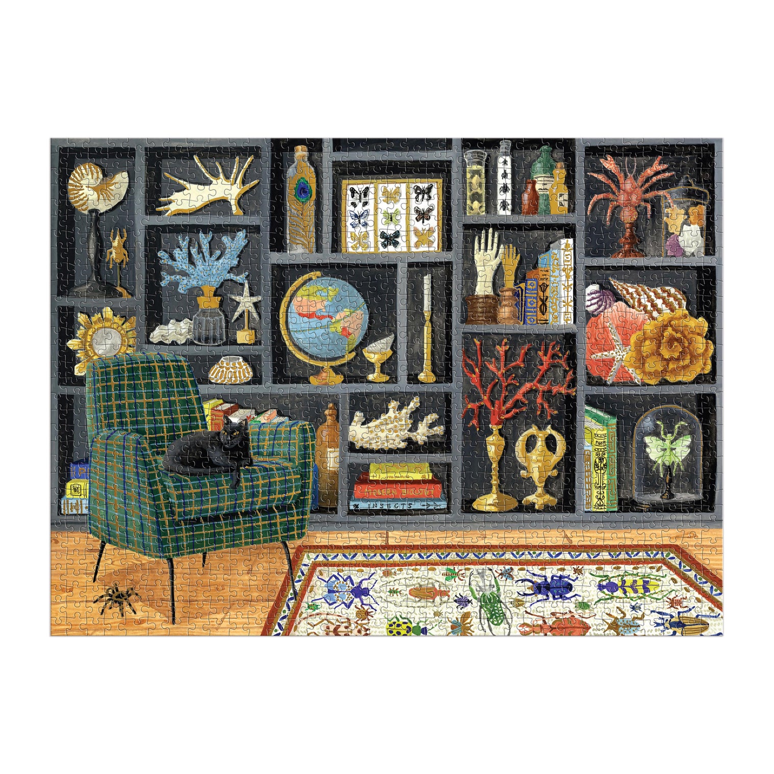 1000 PIECE PUZZLE – Eclectic Treasures 1000 Piece Puzzle by Galison features a unique bookshelf filled with oddities and interesting items.