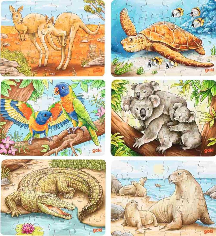 Each design is in it's own little box, so the pieces won't get jumbled up at the end of play time. This toy contains 24 pieces - puzzle pieces are made of wood.
