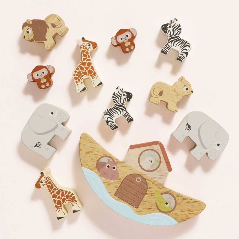 Noah's Balancing Ark. A great way for your child to explore their agility and eye to hand coordination. This fun set comes with ten wooden animals and a beautiful wooden rocking ark featuring a pink whale. Great for manual dexterity, social and individual play.