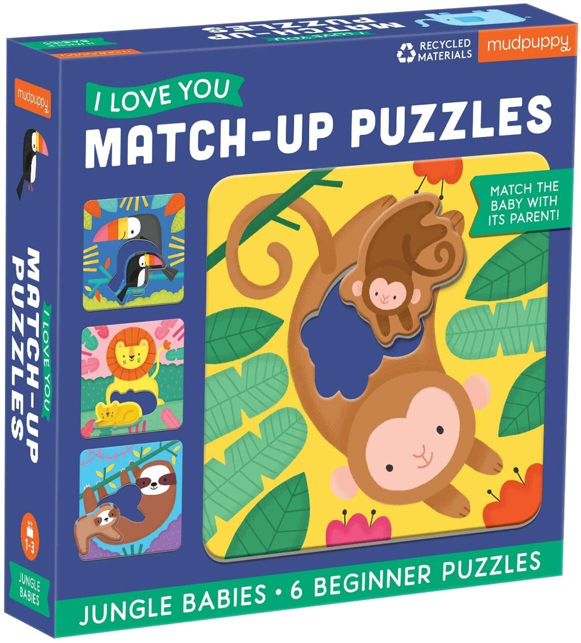 Match the baby with its parent! Jungle Babies I Love You Match-Up Puzzles from Mudpuppy include 6 puzzle boards and 6 shaped puzzle pieces for young puzzlers to match up.