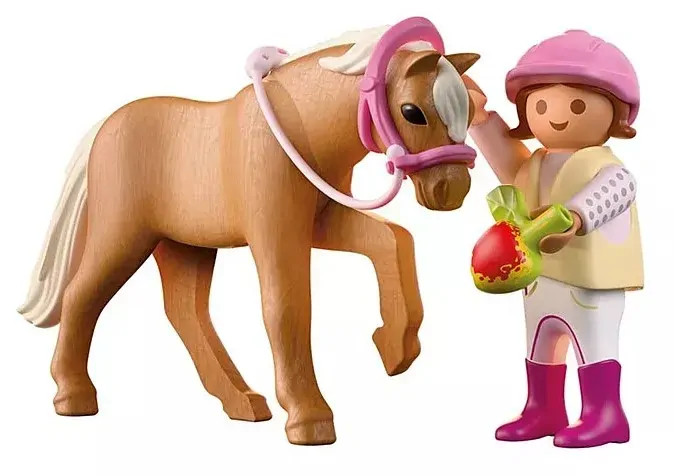 This sweet PLAYMOBIL DuoPack is perfect for little animal lovers. The girl, dressed in her riding vest and removable helmet, brings a juicy apple for her pony friend. The pony's bridle can be taken off, making grooming and feeding even more fun. With poseable parts and charming details, children can enjoy playful stable stories and caring moments.
