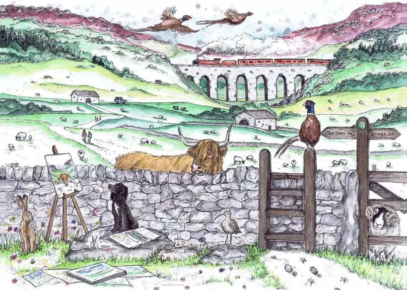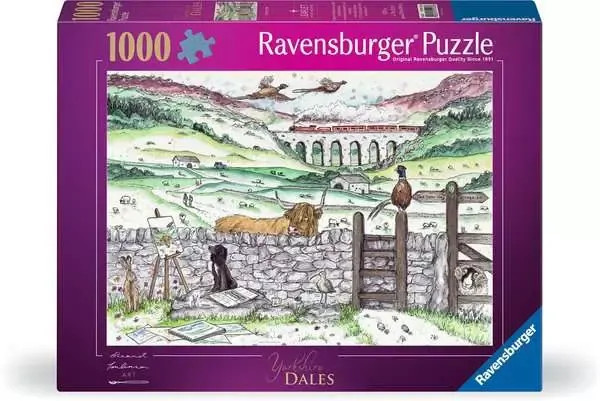 Delve into this 1000-piece jigsaw puzzle that captures the essence of A Day in the Dales. A train gracefully traverses a stone bridge, a snapshot of movement frozen in time. As puzzle pieces are sifted and sorted, the vibrant hues of peacocks in flight catch the eye. Among the group, a curious dog is gazing intently at an easel, its furry companion seemingly engrossed by a painting that holds an unspoken allure. Amidst the landscape, a hare finds a quiet resting place by a stone wall, its calm posture a reminder of the gentle pace of life in the Dales. The puzzle's image unfurls to reveal a field dotted with sheep, each piece clicked into place forming the collective tableau of these peaceful grazers. One sheep stands near the gate, its curiosity evident as it gazes outward, creating a connection between the puzzle's world and that beyond. In a delightful twist, the puzzle captures a Highland cow peering over a stone wall at a painting of itself, bridging the gap between reality and art in an unexpected and endearing way. As each piece finds its place, the puzzle gradually reveals the intricate detail of a day in the Dales, a scene that tells a story of tranquility, curiosity, and the unbreakable bond between nature and its inhabitants.