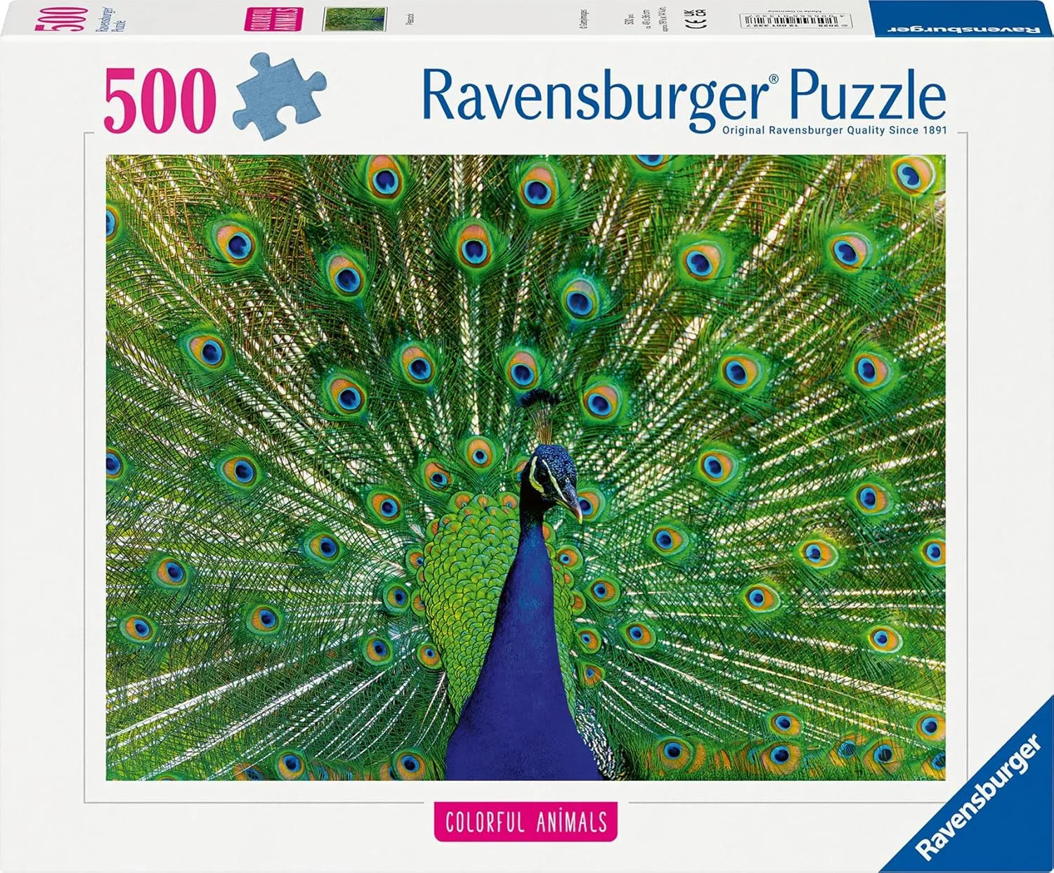 Immerse yourself in the regal beauty of nature with this 500-piece jigsaw puzzle featuring a magnificent peacock. This stunning puzzle captures the splendor of the peacock in all its glory, displaying its vibrant plumage with a dazzling array of iridescent blues, greens, and golds. Each piece brings to life the intricate patterns and colours of the peacock's feathers.