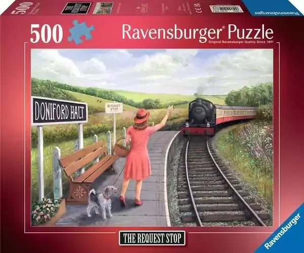 Immerse yourself in a nostalgic scene from yesteryear with our captivating 500-piece puzzle. This charming puzzle captures a moment of timeless elegance as a lady dressed in a vibrant red ensemble, accompanied by her faithful dog and trusty basket, waves to halt an approaching train at the station. So, embark on this nostalgic puzzle adventure and relive the timeless charm of "Request Stop."