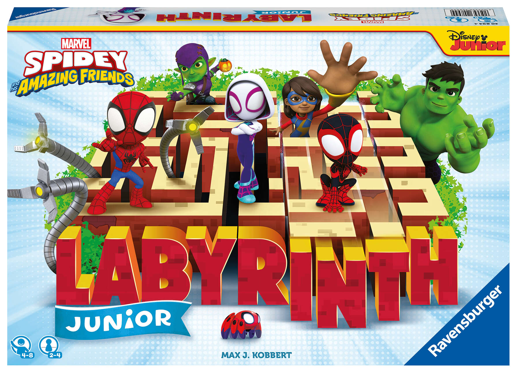 Spider-Man, Spider-Gwen, Miles Morales, and their friends are lost in the labyrinth. Help find them by shifting the maze and moving along the paths. The first to find all the characters on their tokens and return to their starting place wins.