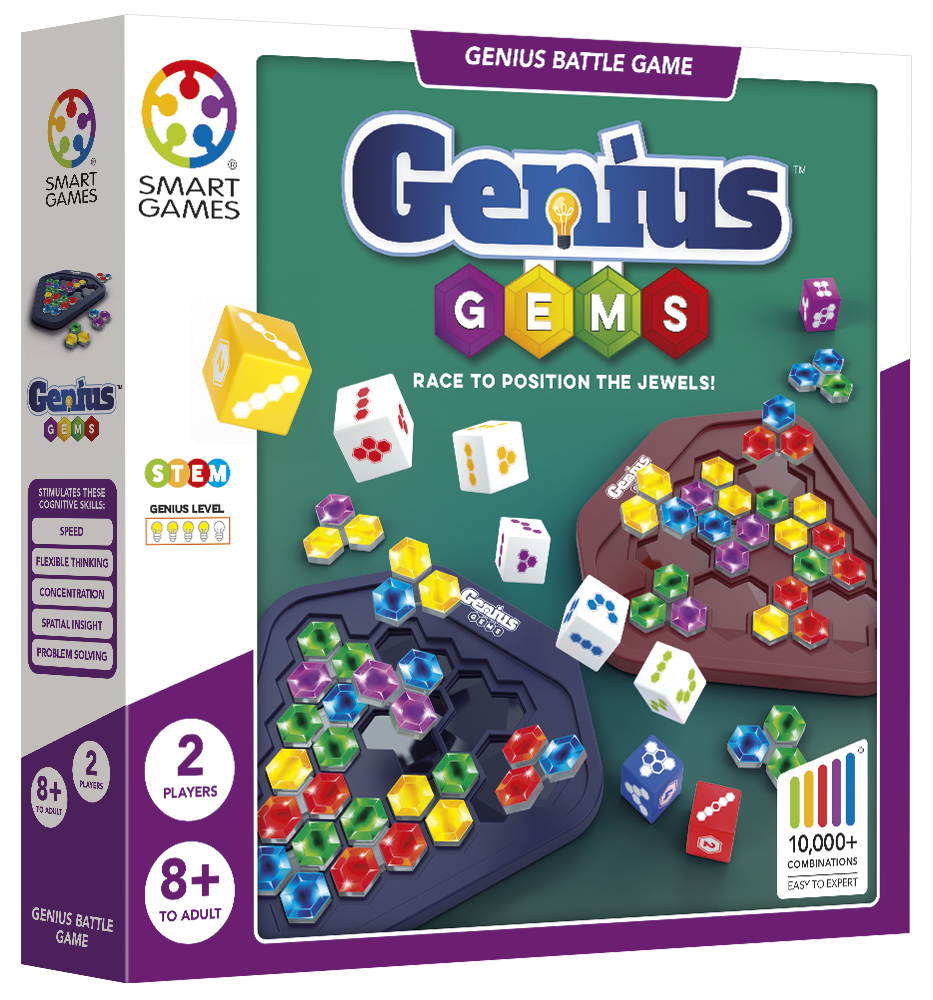Genius Gems challenges players to race their opponent and be the first to fill the game board with the colourful jewel puzzle pieces. But that’s not all! Genius Gems offers five levels of play, with each level becoming more challenging. Players can simply play the starter level…or race through all five levels. The first to solve the Wizard level is the winner! With over 10,000 puzzle combinations possible, Genius Gems provides endless, fast-paced strategic fun.
