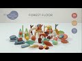 Set includes: six grey flat pebbles, four multi faceted rocks, three cone trees, eight twigs, a snail, a moth, six little toadstools, one large toadstool, ten leaves, two acorns, two beetles, four tunnel pieces, one bird's egg.