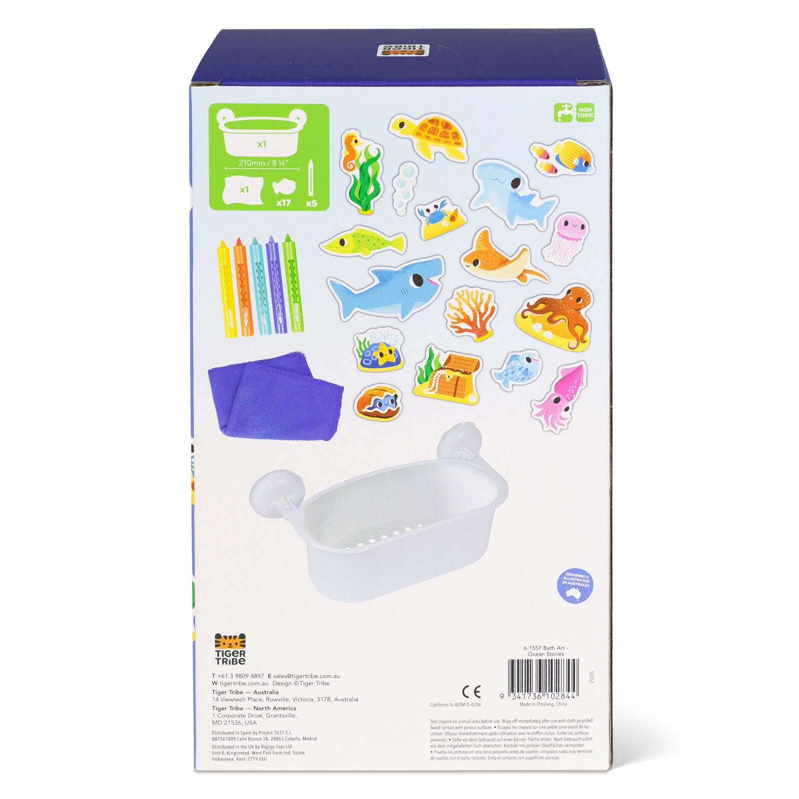 Perfect for storytelling and pretend play, this gorgeous ocean-themed, tub-time meets art-time set includes 5 bath crayons and 17 colourful foam pieces that cling to bath surfaces and can be easily moved around to create endless stories.