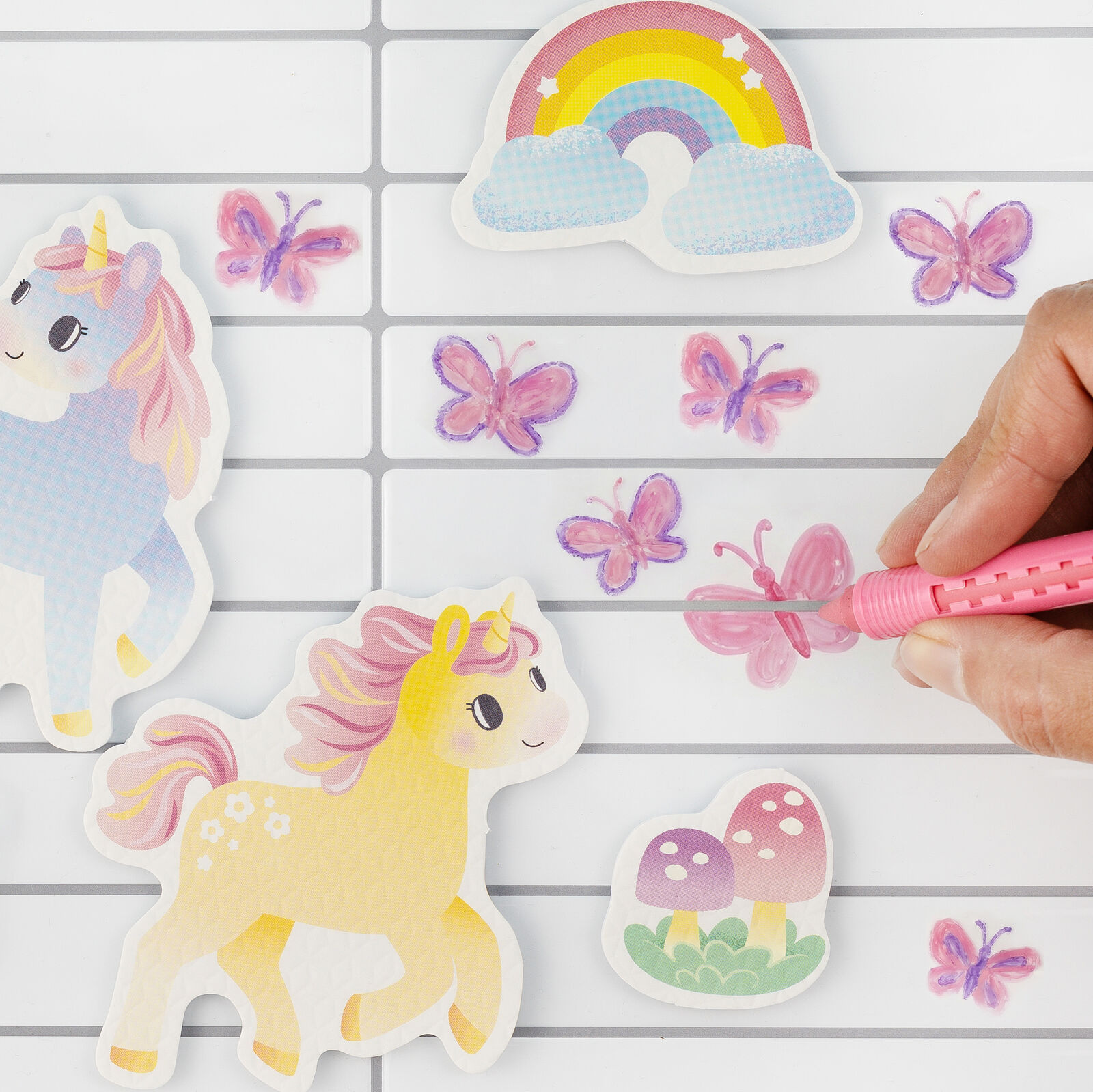 - Unicorn themed Bath Art set with bath crayons and foam stickers