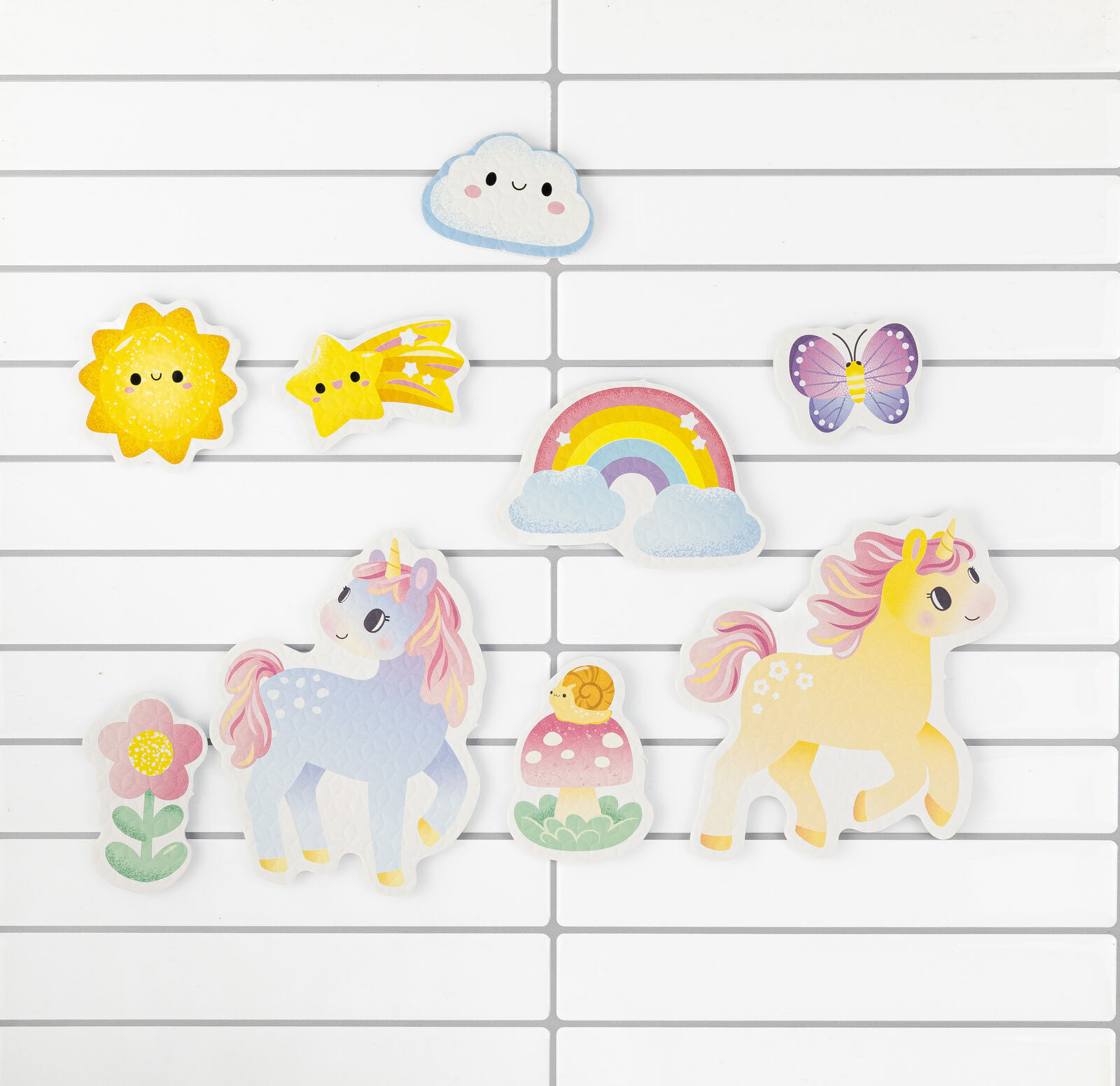 Bath time meets art time! Perfect for storytelling and pretend play, this magical unicorn-themed set includes 5 bath crayons and 17 colourful foam pieces that cling to bath surfaces and can be easily moved around to create endless stories.
